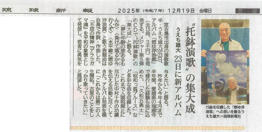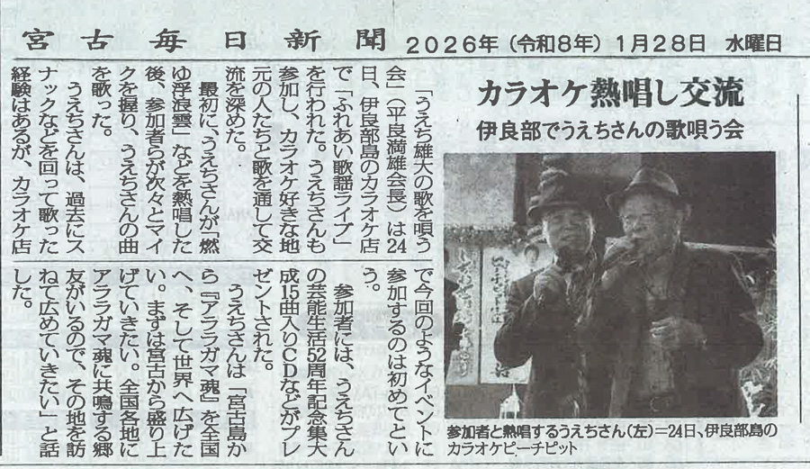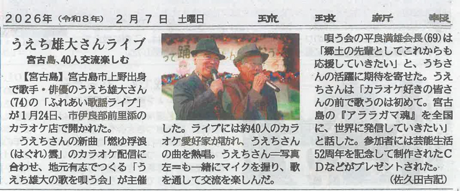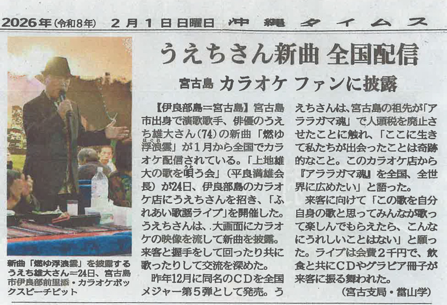 ○2015年 4月 うえち雄大 全国メジャー第三弾「伊良部大橋」のCD発売に伴い、各紙面に紹介していただいた記事を掲載させていただきました。