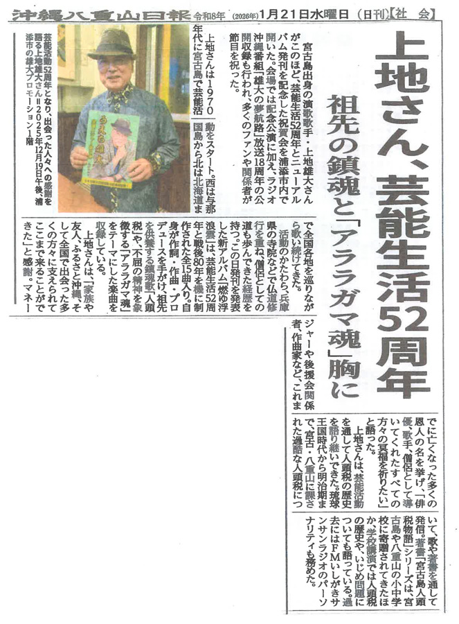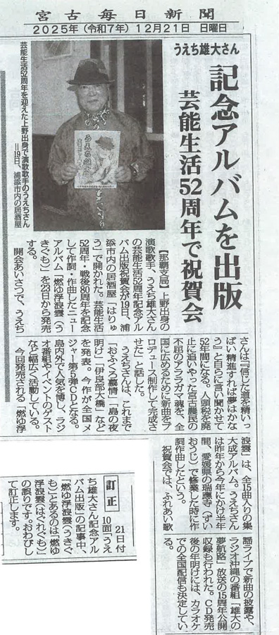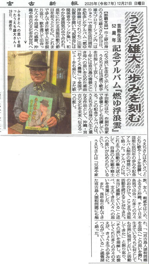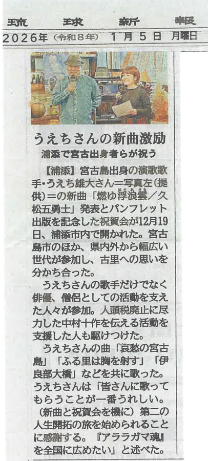 ○2015年 うえち雄大 全国メジャー第三弾「伊良部大橋」のCD発売に伴い、各紙面に紹介していただいた記事を掲載させていただきました。